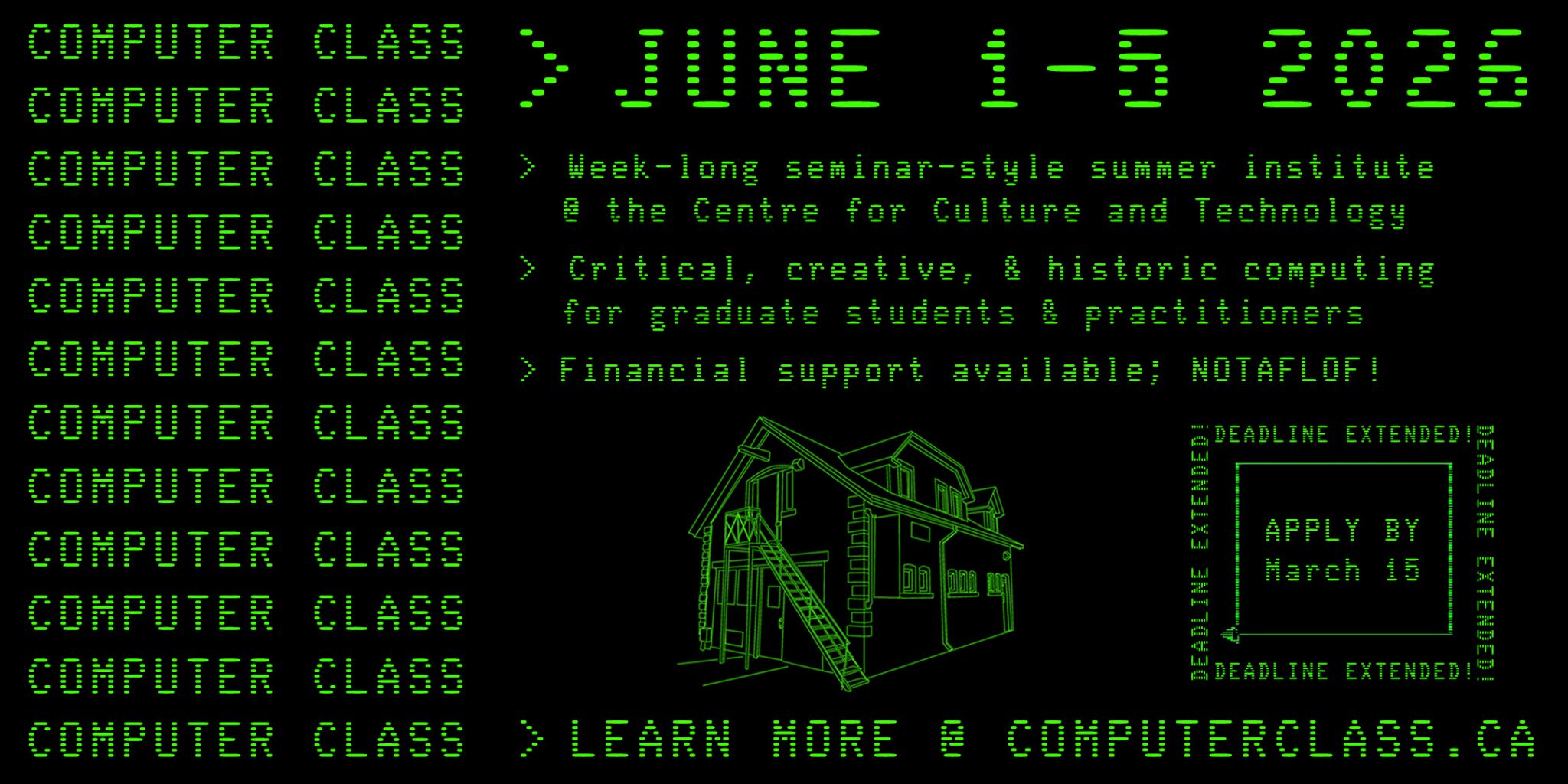 Computer Class is a one-week seminar-style institute for graduate students and practitioners in artistic, humanistic, and social-scientific fields who are interested in coding, computer history, and critical use of technology.